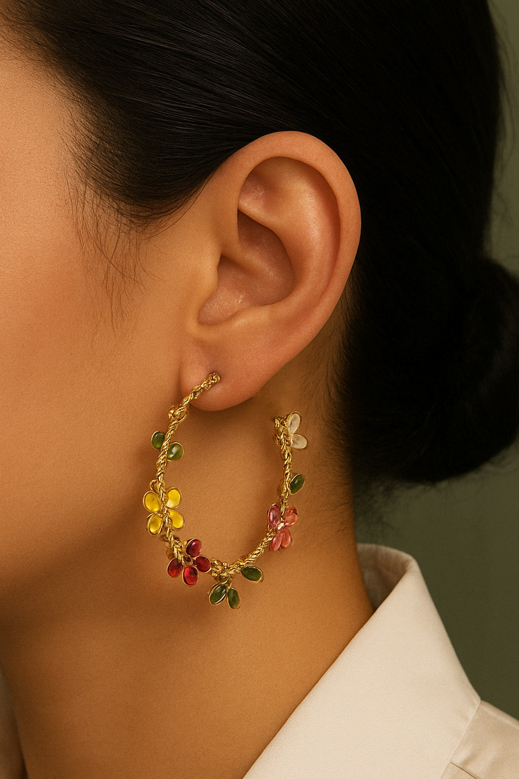 These hoops are handcrafted in goldplated wire feature delicate resin flowers and dreamy details.