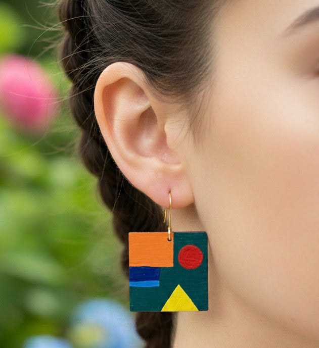 Handcrafted square earrings featuring bold, hand-painted color blocks.