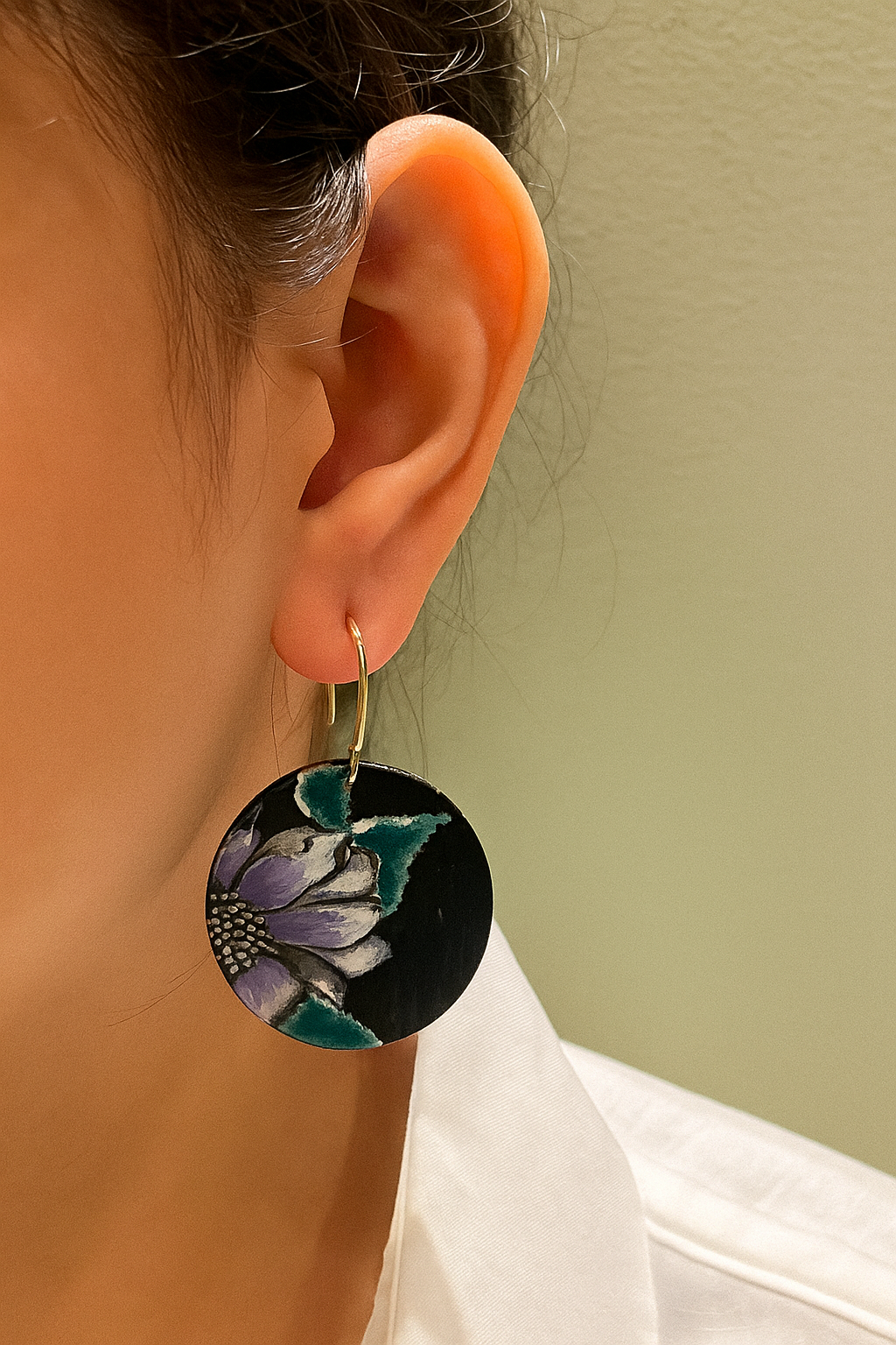 Handcrafted round earrings with hand-painted flower and leaves.